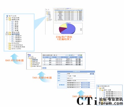 客戶關(guān)系管理,以KPI分析器(KAU)、查詢分析器(SAU)、類(lèi)型分析器(TAU)為核心,實(shí)現(xiàn)客戶信息管理、查詢、分類(lèi)、挖掘的目標(biāo)需求:
