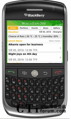 CTI論壇(ctiforum)5月6日消息(記者 楊佳林) 近日,RIM 公司與《上海日報》社共同開發(fā)的BlackBerry上海世博會應用程序正式上線。全球4100萬BlackBerry用戶均可從App World上免費下載并安裝該應用程序,實時獲取最新的上海世博會新聞、場館介紹、世博園區(qū)活動信息等,全方位了解上海世博會。