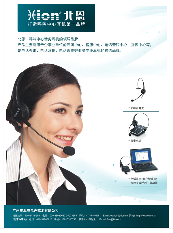 目前北恩Hion耳機品牌已覆蓋全球市場,在北京、上海、廣州、深圳、鄭州、南京設(shè)有售后服務(wù)中心,并在北美、歐洲、南亞等擁有核心合作伙伴。產(chǎn)品主要應(yīng)用于電信、金融、電視購物、物流等客服中心以及總機接線員、指揮中心、呼叫中心等,是電話咨詢、電話營銷、電話調(diào)查等業(yè)務(wù)專業(yè)耳機首選產(chǎn)品。北恩采用最先進耳機生產(chǎn)技術(shù),制造世界一流的通信耳機,全力打造呼叫中心話務(wù)耳機第一品牌。