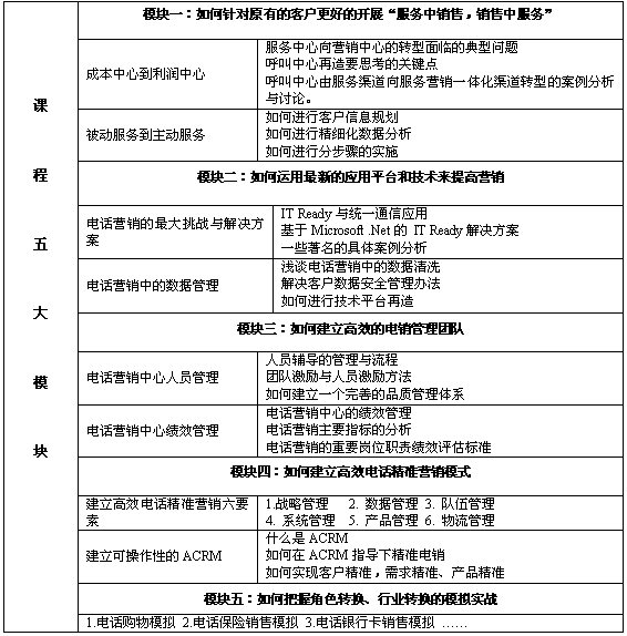 本課程以系統(tǒng)化的眼光,結(jié)合多個國際國內(nèi)領先企業(yè)的營銷與管理實踐案例,與您分享國內(nèi)領先的呼叫中心和電話營銷中心的戰(zhàn)略與運營經(jīng)驗,對現(xiàn)有資源進行合理評估,解決實際問題與困惑,突破面臨的瓶頸,整個課程具有高度的實戰(zhàn)性與可操作性。