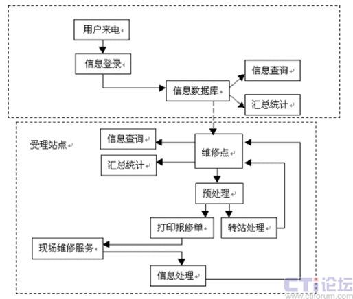 維修點(diǎn)對用戶的報(bào)修情況進(jìn)行預(yù)處理之后,根據(jù)用戶所在的區(qū)域,分配至最近距離的維修站,將用戶與其報(bào)修信息即時(shí)轉(zhuǎn)移,這也就是圖中所顯示的"轉(zhuǎn)站處理"。之后,維修站將直接打印出報(bào)修單,加快服務(wù)實(shí)施的效率、減少人工出錯(cuò)的比例,有專業(yè)人員及時(shí)上門服務(wù)檢修。