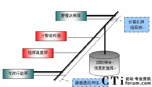 通過對(duì)消防安全監(jiān)控指揮中心業(yè)務(wù)的分析,引進(jìn)先進(jìn)的數(shù)據(jù)通信網(wǎng)絡(luò)和語音通訊網(wǎng)絡(luò),我們可以將未來的消防業(yè)務(wù)層次抽象地概括為四層(如圖所示):管理決策層、火警監(jiān)測層、指揮調(diào)度層和作戰(zhàn)行動(dòng)層。與管理決策層對(duì)應(yīng)的組織機(jī)構(gòu)為消防通信指揮中心;與火警檢測層、指揮調(diào)度層對(duì)應(yīng)包括消防指揮中心的接處警子系統(tǒng)、指揮調(diào)度等子系統(tǒng);與作戰(zhàn)行動(dòng)層對(duì)應(yīng)的組織機(jī)構(gòu)為消防站(消防隊(duì))和消防車及消防隊(duì)員。