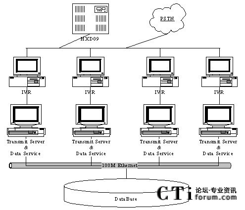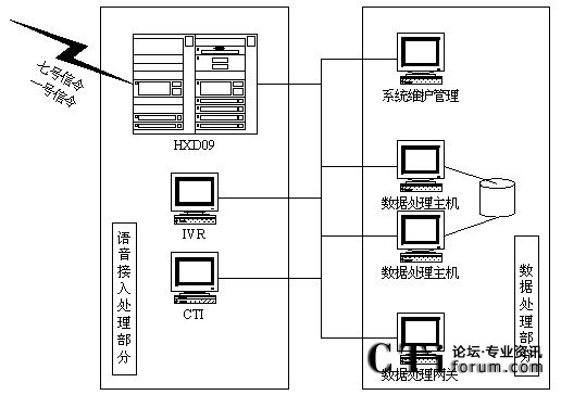 語(yǔ)音接入處理部分主要完成用戶(hù)的語(yǔ)音話(huà)路接入功能。其中:HXD09語(yǔ)音交換機(jī)可以支持七號(hào)信令和一號(hào)信令的數(shù)字E1線(xiàn)路的接入。HXD09的IVR完成自動(dòng)業(yè)務(wù)受理功能,實(shí)現(xiàn)系統(tǒng)7*24小時(shí)不間斷服務(wù)。CTI完成對(duì)排隊(duì)機(jī)的監(jiān)視、控制任務(wù),并能夠?qū)崟r(shí)的提供每個(gè)語(yǔ)音通道的信息配合IVR完成自動(dòng)繳費(fèi)業(yè)務(wù)的實(shí)現(xiàn)。