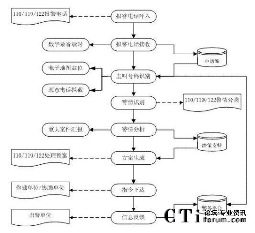 該系統(tǒng)主要分為電信子系統(tǒng)(完成聯(lián)動中心與各電信公司之間話音的傳輸、交換和分配,以及主叫號碼和主叫地址的自動查詢和傳輸?shù)龋⒔泳行淖酉到y(tǒng)(統(tǒng)一接聽和處理市民的報警、求助電話)、指揮調(diào)度子系統(tǒng)(或稱為處警中心,通過直觀的地理信息系統(tǒng)和數(shù)據(jù)庫,可以對所有的資源和警力分布了如指掌。通過一體化的無線數(shù)據(jù)傳輸和無線調(diào)度臺進(jìn)行方便的統(tǒng)一管理,指揮和調(diào)度)、信息網(wǎng)絡(luò)子系統(tǒng)(聯(lián)動中心的骨干網(wǎng)絡(luò),把各種數(shù)據(jù)數(shù)庫、接處警席位、移動的警用車載計算機等互聯(lián)在一起,形成一個強大的信息網(wǎng)絡(luò))、無線指揮調(diào)度通信子系統(tǒng)、大屏幕顯示子系統(tǒng)、地理信息子系統(tǒng)、GPS/GIS子系統(tǒng)。