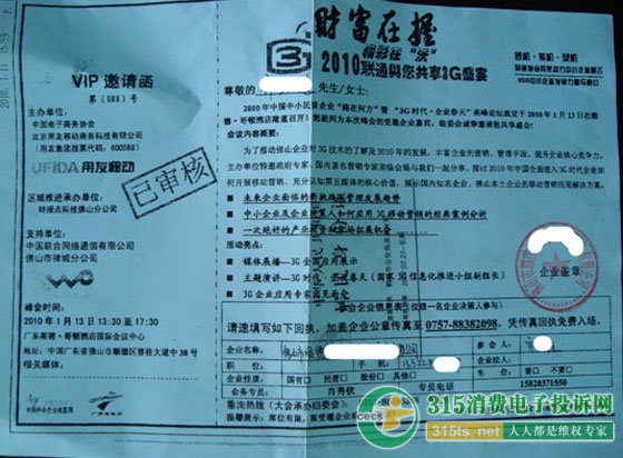 會(huì)場(chǎng)到處都洋溢“中國(guó)聯(lián)通”的氣息。如現(xiàn)場(chǎng)有眾多中國(guó)聯(lián)通的3G宣傳廣告,且發(fā)的材料中還有一份是中國(guó)聯(lián)通的宣傳單,另外,會(huì)議現(xiàn)場(chǎng)甚至還有聯(lián)通3G手機(jī)銷售柜臺(tái)。種種情況讓齊先生等人更堅(jiān)定了他們參加的就是中國(guó)聯(lián)通組織的會(huì)議。