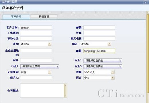 對新添加的客戶錄入客戶信息資料,包括客戶的名稱、郵箱等,為其建立起一個新的客戶關(guān)系,可以隨時找到該客戶的具體信息以及他的銷售情況,方便對客戶銷售進程有一個充分地實時跟蹤,并為之更好地服務(wù)。