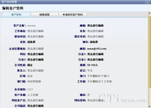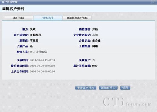 點擊標簽選擇要查看的客戶資料,和銷售進程。查看客戶日志能看到該客戶被執(zhí)行操作的歷史情況,例如資料的變更,所屬的變更等等。添加聯(lián)系人是指為當(dāng)前客戶添加新的聯(lián)系人,添加完聯(lián)系人信息后,聯(lián)系人就會被納入到該客戶資料里。