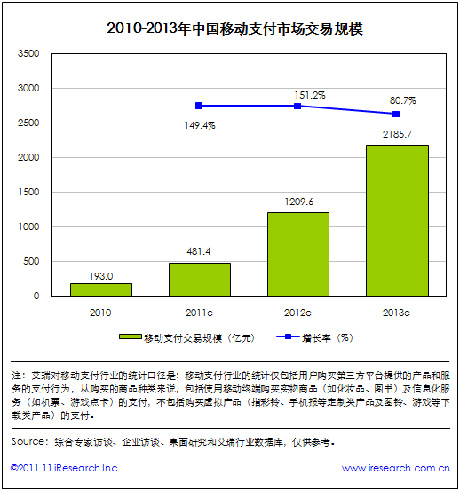 艾瑞咨詢數(shù)據(jù)顯示,截至2011年底,中國(guó)移動(dòng)支付交易規(guī)?傤~將達(dá)到481.4億元,同比增長(zhǎng)149.4%,整體呈現(xiàn)爆發(fā)式的增長(zhǎng)態(tài)勢(shì)。艾瑞預(yù)計(jì),中國(guó)移動(dòng)支付交易規(guī)模將在2013年底超過2000億元。