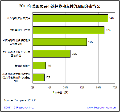 iResearch 艾瑞咨詢整理Compete 的最新數(shù)據(jù)研究發(fā)現(xiàn),在未選擇移動支付的美國居民中,有64%的受訪者認為移動支付不安全,這成為美國居民選擇移動支付的最大障礙。另有61%的受訪者表示目前仍希望使用其他支付方式,此外還有46%的居民只使用移動設備接打電話或收發(fā)郵件。