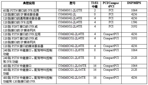 CG 6060系列產(chǎn)品體系設(shè)計(jì)在單塊板卡上集成了PSTN接口、電信協(xié)議、全面的IVR功能、全雙工回音消除、語音編碼、傳真處理、會(huì)議應(yīng)用、視頻處理、快速以太接口和數(shù)據(jù)包協(xié)議。這種集成產(chǎn)生了經(jīng)濟(jì)型、可擴(kuò)展的系統(tǒng)平臺(tái),可以滿足OEM供應(yīng)商對120路接口以上新一代匯聚應(yīng)用解決方案的研制需求。