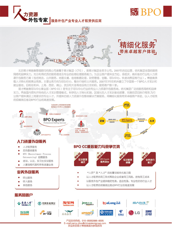 北京易才博普奧管理顧問(wèn)有限公司(CTG BPO)是易才集團(tuán)全資子公司。2007年啟動(dòng)運(yùn)營(yíng),依托集團(tuán)全國(guó)的服務(wù)網(wǎng)絡(luò)和品牌實(shí)力,充分利用優(yōu)質(zhì)的服務(wù)理念及專(zhuān)業(yè)的信息處理服務(wù)能力,為企業(yè)客戶(hù)提供全方位、多層次、高標(biāo)準(zhǔn)的行業(yè)性人力資源外包服務(wù)方案(包括物流、公共服務(wù)、地面交通、信息數(shù)據(jù)處理、財(cái)務(wù)管理、金融、呼叫中心、快速消費(fèi)品等行業(yè))。