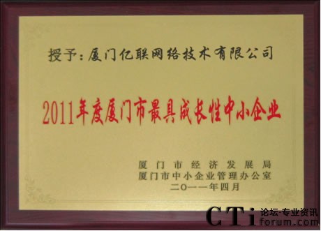 億聯(lián)公司憑借國際領(lǐng)先技術(shù)、快速穩(wěn)定的增長模式、良好的企業(yè)信用以及為全球客戶提供高品質(zhì)、高性價比的產(chǎn)品和專業(yè)快速的技術(shù)支持在眾多參選企業(yè)中表現(xiàn)優(yōu)異,獲得了評委們一致的青睞,最終捧回了“2011年廈門市最具成長性中小企業(yè)”大獎。
