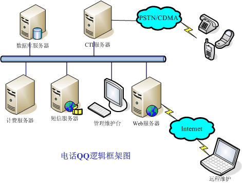 電話QQ系統(tǒng)主要由CTI服務(wù)器、數(shù)據(jù)庫服務(wù)器、計(jì)費(fèi)服務(wù)器、短信服務(wù)器、管理維護(hù)臺(tái)和Web服務(wù)器組成。