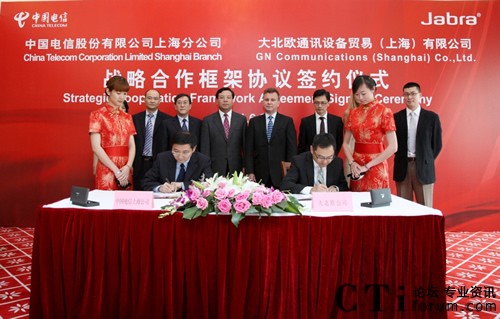 CTI論壇(ctiforum)6月23日消息(記者 楊佳林):上!蝾I(lǐng)先的創(chuàng)新耳麥解決方案提供商大北歐公司(GN Netcom)與中國電信上海公司(以下簡(jiǎn)稱上海電信)今日隆重舉辦了 “戰(zhàn)略合作框架協(xié)議簽約儀式”。上海電信資深經(jīng)理花銳強(qiáng)、大北歐公司亞太區(qū)總裁Mark Leigh,及雙方公司高層領(lǐng)導(dǎo)共同出席了此次慶典。Mark Leigh先生還代表了大北歐公司將Edouard Suenson先生——“將電報(bào)引入中國的丹麥人”的雕像捐贈(zèng)給上海電信博物館,見證了中國與丹麥源于19世紀(jì)末在通信方面的成功合作。