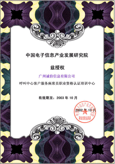 近日,廣州誠伯信息有限公司正式成為信息產(chǎn)業(yè)部電子行業(yè)技能鑒定指導中心授權(quán)的"呼叫中心職業(yè)標準體系"培訓單位。