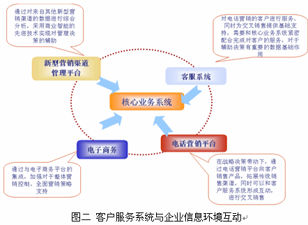 客戶服務(wù)系統(tǒng)不是孤立的系統(tǒng),是能夠與客戶現(xiàn)有信息環(huán)境,包括:核心業(yè)務(wù)系統(tǒng)、多渠道營(yíng)銷、電子商務(wù)等進(jìn)行互動(dòng)的智能信息系統(tǒng),從而使呼叫中心成為企業(yè)的戰(zhàn)略資產(chǎn),幫助企業(yè)提升客戶滿意度、深度挖掘客戶價(jià)值?蛻舴⻊(wù)系統(tǒng)與企業(yè)其它信息系統(tǒng)的互動(dòng)可以通過圖二反映。