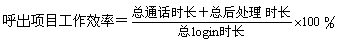 - 定義:呼出項(xiàng)目的工作效率是衡量呼出項(xiàng)目座席工作負(fù)荷率的主要KPI,一般指某段統(tǒng)計(jì)時(shí)間內(nèi),總處理時(shí)長(zhǎng)與登錄系統(tǒng)時(shí)長(zhǎng)的比率。對(duì)于沒(méi)有座席操作系統(tǒng)的呼叫中心可以將分母換成計(jì)劃工作時(shí)長(zhǎng)。