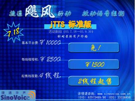2003年7月18日,北京捷通華聲語(yǔ)音技術(shù)有限公司正式發(fā)布捷通華聲語(yǔ)音合成技術(shù) “jTTS標(biāo)準(zhǔn)版”。為慶祝“jTTS標(biāo)準(zhǔn)版”的正式上市,為期近三個(gè)月,推廣“jTTS標(biāo)準(zhǔn)版”的捷通“颶風(fēng)行動(dòng)”也在同一時(shí)間正式啟動(dòng)! 捷通“颶風(fēng)行動(dòng)”的宗旨--用全新的產(chǎn)品、全方位的服務(wù)、最具競(jìng)爭(zhēng)力的價(jià)格與所有CTI領(lǐng)域的企業(yè)合作,開(kāi)啟面向中小型CTI系統(tǒng)語(yǔ)音應(yīng)用的市場(chǎng)大門(mén),為CTI產(chǎn)業(yè)發(fā)展提供持久動(dòng)力支持!