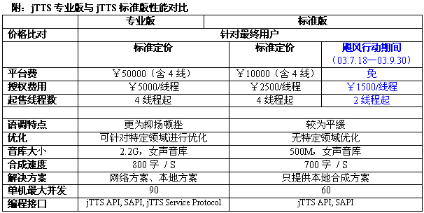 1)為"jTTS標(biāo)準(zhǔn)版"提供進(jìn)一步的優(yōu)惠價(jià)格。(詳情請(qǐng)聯(lián)系捷通市場(chǎng)營(yíng)銷(xiāo)中心)