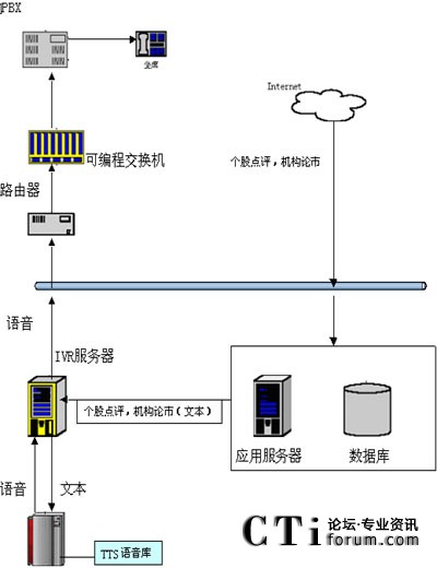 技術(shù)實(shí)現(xiàn)上,證券交易所可從網(wǎng)上下載個(gè)股點(diǎn)評(píng)信息或熱門個(gè)股信息,之后將這些信息的文本傳遞給IVR服務(wù)器,IVR會(huì)通過(guò)調(diào)用TTS服務(wù)器得到這些信息的語(yǔ)音流,之后就可以在坐席上播放這些信息的語(yǔ)音了。如圖所示: