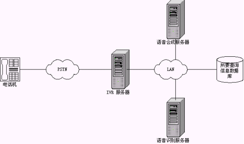 這種模式是最常見的一種接入情況。將原有煩瑣的按鍵式提示改成更具人性化的交談式語音交互,類似于語音門戶模式。這是目前大家普遍認(rèn)同的一種語音識(shí)別技術(shù)應(yīng)用方式。相比原有的按鍵方式,系統(tǒng)的新穎程度、個(gè)性化程度、用戶操作的方便程度等都得到了極大的提高,如語音識(shí)別技術(shù)在股票查詢中的成功應(yīng)用,在點(diǎn)歌系統(tǒng)中的成功應(yīng)用等;另外利用語音識(shí)別技術(shù)也解決了一些原有系統(tǒng)無法實(shí)現(xiàn)的技術(shù)難題,如火車時(shí)刻查詢、機(jī)場(chǎng)航班查詢等,原有系統(tǒng)借助郵政編碼、電話區(qū)號(hào)等的方式讓人無所適從,現(xiàn)在直接和系統(tǒng)交談,順利獲取所需信息,可以說是語音識(shí)別技術(shù)一個(gè)成功的應(yīng)用。這種系統(tǒng)的拓?fù)浣Y(jié)構(gòu)如下圖示: