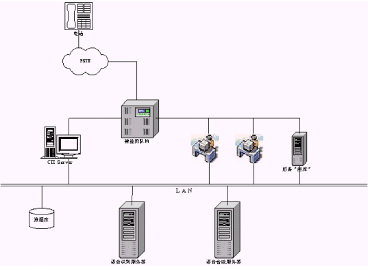 IVR模式是最常見的一種模式,這種模式也可以結(jié)合應(yīng)用到前端以交換機(jī)接入的系統(tǒng)中去,在系統(tǒng)的IVR服務(wù)流程上,做出相應(yīng)的修改,加入語音識(shí)別技術(shù),同樣可以得到成功應(yīng)用。另外一種模式暫且稱它為后備模式,該模式一個(gè)主要的特點(diǎn)是放在后端,比如在有座席接聽的情況下,采用語音識(shí)別技術(shù)的系統(tǒng)不被激活,也就是系統(tǒng)不給派線。當(dāng)系統(tǒng)繁忙,而座席都占用的情況下,系統(tǒng)派線到采用語音識(shí)別技術(shù)的系統(tǒng),如同一個(gè)備用的座席。在這樣一個(gè)"座席"的軟件設(shè)計(jì)上,如同與人的交談一樣,系統(tǒng)也提出正常的詢問,但必須強(qiáng)調(diào)引導(dǎo)用戶來按照事先設(shè)定好的流程進(jìn)行。這樣可以保證系統(tǒng)的接通率,特別是在一些對(duì)接通率和服務(wù)及時(shí)性要求比較高的場(chǎng)合采用,典型的代表如電信114查號(hào)臺(tái)和移動(dòng)的1860客服中心,這些系統(tǒng)往往是隨著用戶急劇增加,撥打量也在穩(wěn)步上升,而呼叫響應(yīng)要求及時(shí)。系統(tǒng)拓?fù)浣Y(jié)構(gòu)如下圖示。