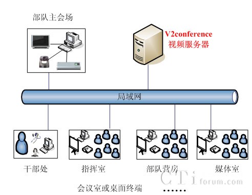 V2視頻會議系統(tǒng)建立在森警部隊專網(wǎng)的基礎(chǔ)上,各區(qū)作戰(zhàn)部隊會議室、指揮室和部隊營房會議均為光纖100M接入,每個中隊官兵營房都集中建立了培訓(xùn)會議室,負(fù)責(zé)日常新兵的培訓(xùn)教育。在現(xiàn)有的網(wǎng)絡(luò)基礎(chǔ)上構(gòu)建了V2視頻會議系統(tǒng),來滿足各個中隊和教導(dǎo)大隊的網(wǎng)絡(luò)會議和培訓(xùn)需求。在每個節(jié)點會議室部署了電視、攝像頭和相關(guān)音響設(shè)備,目前已經(jīng)建成10多個網(wǎng)絡(luò)會議節(jié)點的遠(yuǎn)程視頻培訓(xùn)系統(tǒng)。