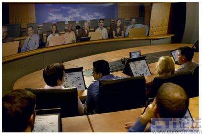 我們之前提到的遠(yuǎn)程呈現(xiàn)產(chǎn)品中前四種都屬于“面對(duì)面”系列。其會(huì)議室布局簡(jiǎn)潔,會(huì)議桌的一側(cè)是座椅,另一側(cè)是等離子顯示屏;會(huì)議連通后,屏幕中將出現(xiàn)近乎真人比例的遠(yuǎn)程與會(huì)者,每個(gè)顯示屏可容納兩個(gè)人,而且屏幕為每個(gè)人都預(yù)留了足夠的活動(dòng)空間,來(lái)施展肢體語(yǔ)言。但是,如果你習(xí)慣開(kāi)會(huì)時(shí)使用白板,并站在旁邊邊寫(xiě)邊講,那么就需要您在“面對(duì)面”會(huì)議中克服一下了,因?yàn)橐坏┠鷱淖簧险酒饋?lái),在對(duì)方眼中您將面臨“切頭”的惡果,當(dāng)然遠(yuǎn)程呈現(xiàn)中的雙流功能,可以讓與會(huì)雙方輕松實(shí)現(xiàn)內(nèi)容共享,白板是根本用不上的。