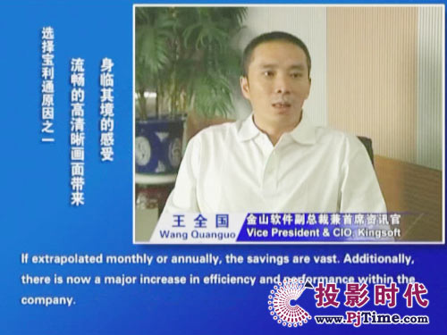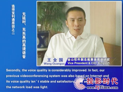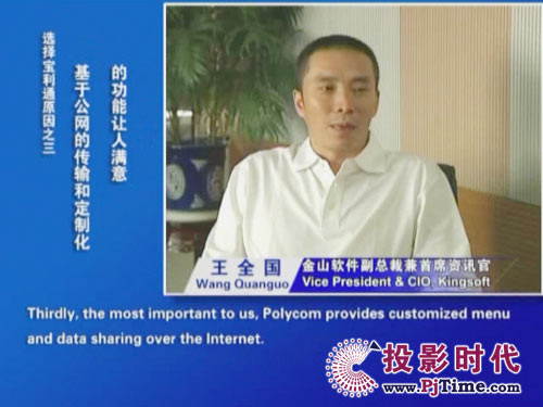 金山軟件副總裁兼首席資訊官王全國先生說道:“對于軟件行業(yè)來說,及時、高效的溝通是保持競爭優(yōu)勢的重要前提。相比之前使用的標清產(chǎn)品,寶利通高清視頻會議系統(tǒng),提供了完全不同的體驗,流暢的高清晰畫面猶如真實的面對面溝通。而且我們公司并沒有申請專線,所有的應(yīng)用都是基于公網(wǎng)實現(xiàn)的。另一方面,新型全中文定制菜單的運用,令我們使用起來非常方便,這更提高了我們使用視頻通信手段實現(xiàn)異地溝通的熱情。”