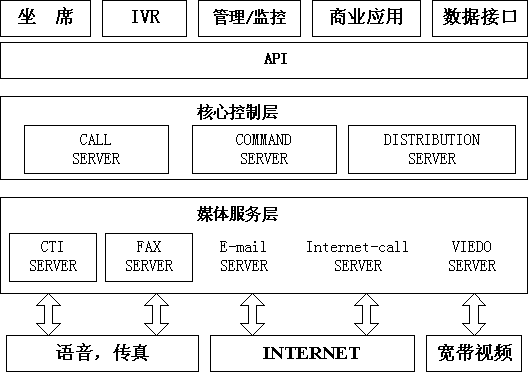 需要指出的是,由于ICSYS智能平臺系統(tǒng)采用了媒體服務(wù)層,上述所有Internet 呼叫事件都統(tǒng)一發(fā)送到系統(tǒng)核心層,所有呼叫的路由都由核心層Distribution Server來統(tǒng)一分配,從而保證了多種媒體的統(tǒng)一接入和統(tǒng)一排隊(duì)。三 商業(yè)應(yīng)用