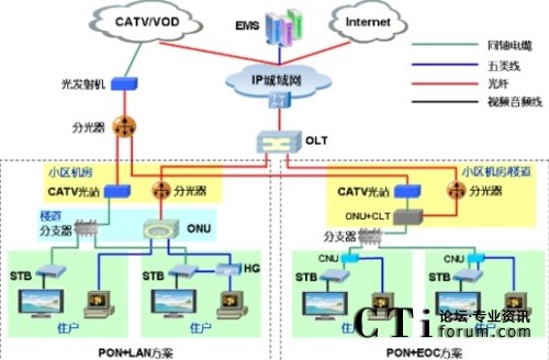 其中,xPON+EoC解決方案專門針對老小區(qū)或五類線無法入戶小區(qū)。該方案采用頻分復(fù)用技術(shù),可實現(xiàn)有線電視射頻信號和以太網(wǎng)IP數(shù)據(jù),在一根同軸電纜內(nèi)同時傳輸,充分利用已有的同軸電纜資源,混合信號在客戶端進(jìn)行分離,射頻信號連接至電視機或數(shù)字機頂盒,IP 數(shù)據(jù)信號連接至電腦,最終實現(xiàn)HFC雙向化改造及寬帶接入。配合雙向互動機頂盒,廣電能提供交互電視、視頻點播等多種增值業(yè)務(wù)。更重要的是,該方案能夠?qū)崿F(xiàn)xPON設(shè)備和EoC設(shè)備的統(tǒng)一管理,對設(shè)備、業(yè)務(wù)帶寬及網(wǎng)絡(luò)帶寬進(jìn)行適配與管理,確保業(yè)務(wù)質(zhì)量,做到可管到戶、可控到戶、可控到每個業(yè)務(wù),大大降低廣電的管理和運維成本,提升廣電的服務(wù)能力,為實現(xiàn)全國有線電視網(wǎng)絡(luò)統(tǒng)一規(guī)劃、統(tǒng)一建設(shè)、統(tǒng)一運營、統(tǒng)一管理奠定結(jié)實的基礎(chǔ)。