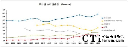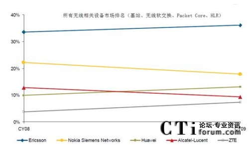 CTI論壇(ctiforum)4月16日消息(記者 潘婷婷): 近日,業(yè)內(nèi)著名調(diào)研公司Infonetics發(fā)布了2009年全球無線通信設(shè)備市場研究報告《2G/3G Mobile Infrastructure and Subscribers》。根據(jù)報告顯示,2009年全年,全球無線通信市場份額出現(xiàn)了較大變化,按載頻計,中興通訊全年以12.6%的全球市場份額超越阿爾卡特-朗訊,居行業(yè)第4,按載頻計,2009年全球無線設(shè)備出貨市場份額排名為愛立信、華為、諾基亞-西門子、中興、阿爾卡特-朗訊,分別為28.2%,22.1%,19%,12.6%和9.2%。