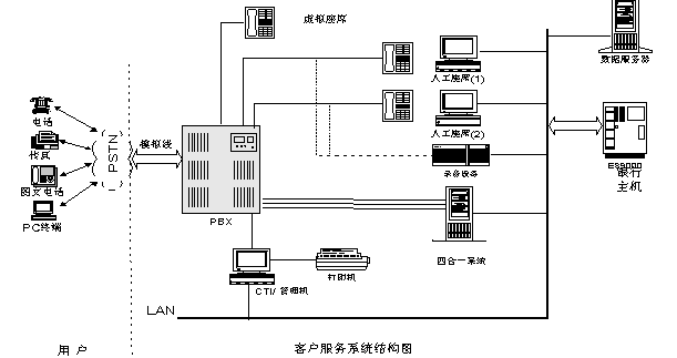 銀行客戶(hù)撥入銀行客戶(hù)服務(wù)中心系統(tǒng)后,首先聽(tīng)到歡迎詞“歡迎進(jìn)入客戶(hù)服務(wù)中心系統(tǒng),按1對(duì)公查詢(xún),按2儲(chǔ)蓄查詢(xún),按3信用卡查詢(xún),按4金融信息查詢(xún),按5人工服務(wù)”,如果客戶(hù)選擇語(yǔ)音、傳真自動(dòng)服務(wù),則進(jìn)入IVR系統(tǒng),客戶(hù)可以按照語(yǔ)音提示進(jìn)行選擇,獲得相應(yīng)自動(dòng)服務(wù),如果用戶(hù)選擇人工服務(wù),則進(jìn)入人工服務(wù)系統(tǒng),由銀行業(yè)務(wù)人員提供相應(yīng)人工服務(wù)。如果用戶(hù)使用金融圖文電話(huà)或終端進(jìn)入銀行客戶(hù)服務(wù)中心,則系統(tǒng)自動(dòng)轉(zhuǎn)到IVR系統(tǒng)中的MODEM,提供相應(yīng)遠(yuǎn)程查詢(xún)服務(wù)。