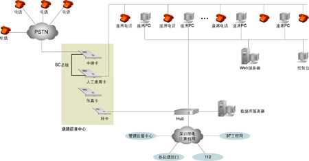 系統(tǒng)的核心是話路語音中心,主要實現(xiàn)兩大功能: 一是實現(xiàn)180系統(tǒng)的話路語音平臺; 二是實現(xiàn)與電話網(wǎng)絡的接口。以1臺Pentium級工控機作為處理平臺,2塊30線數(shù)字中繼語音處理卡,1塊帶振鈴器的24線模擬座席電話轉接卡,1塊4路傳真卡,卡間以語音處理行業(yè)的標準總線SC總線相連。系統(tǒng)與電信網(wǎng)絡的接口采用E1數(shù)字中繼線,信令方式采用中國一號信令為隨路信令,工控機用TCP/IP協(xié)議與局域網(wǎng)相連。