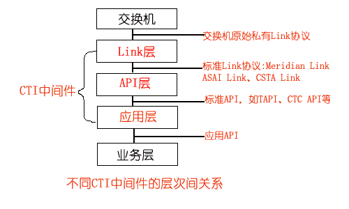 在Link層的基礎(chǔ)上,實現(xiàn)把標準Link協(xié)議轉(zhuǎn)化為標準的API,如CTC API、TAPI、JTAPI等,為CTI應用開發(fā)提供一套標準的API,屏蔽了不同交換機擁有的CTI協(xié)議和CTI接口,使應用程序員無需關(guān)心消息是如何在計算機和交換機之間傳遞,專注于客戶端的應用開發(fā),實現(xiàn)應用程序與交換機平臺無關(guān)性。