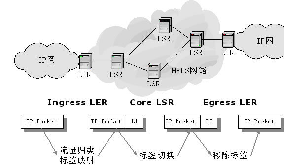 標(biāo)簽邊緣路由器(Lable Edge Router,LER):LER是MPLS網(wǎng)絡(luò)同其他網(wǎng)絡(luò)相連的邊緣設(shè)備,它提供流量分類和標(biāo)簽的映射(作為Ingress)、標(biāo)簽的移除功能。