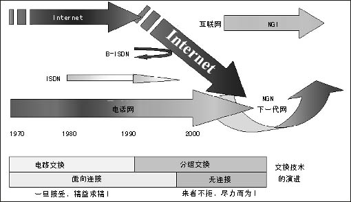 傳統(tǒng)電信網(wǎng)和互聯(lián)網(wǎng)都面臨著挑戰(zhàn),基于電話業(yè)務(wù)設(shè)計的電路交換網(wǎng)不能靈活適應(yīng)帶寬各異的數(shù)據(jù)業(yè)務(wù)的發(fā)展。專為數(shù)據(jù)業(yè)務(wù)設(shè)計的互聯(lián)網(wǎng)則存在著安全性、可管理性、商業(yè)模式等問題的困擾。NGI對目前電信網(wǎng)的主要盈利業(yè)務(wù)語音的質(zhì)量保證以及對電信網(wǎng)增長空間很大的業(yè)務(wù)(移動)關(guān)注不夠。NGI可能達(dá)到的目標(biāo)不能滿足電信界的需要。因此,在NGI之后ITU和ETSI等提出了更高的目標(biāo)——NGN,這就是NGN的提出背景。信息產(chǎn)業(yè)部電信研究院科技委副主任委員雷震洲認(rèn)為,兩大亮點點燃了NGN:一是數(shù)據(jù)超過語音的信息需求,全球互聯(lián)網(wǎng)用戶目前已逾7億,全世界在網(wǎng)上傳送的以IP為代表的數(shù)據(jù)業(yè)務(wù)量已經(jīng)超過語音業(yè)務(wù)量;二是移動超過固定的個性化需求,全球移動用戶已經(jīng)超過13億,近100個國家的移動用戶數(shù)已經(jīng)超過固定用戶數(shù),我國在2003年10月移動用戶也超過了固定用戶數(shù)。