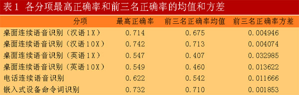 從各分項(xiàng)前三名的正確率方差可以看出,漢語(yǔ)桌面連續(xù)語(yǔ)音識(shí)別和嵌入式設(shè)備命令詞分項(xiàng)中各系統(tǒng)的性能差異較小,而英語(yǔ)桌面連續(xù)語(yǔ)音識(shí)別,特別是一倍實(shí)時(shí)任務(wù)中各系統(tǒng)性能差異較大。這是因?yàn)楫?dāng)前語(yǔ)音識(shí)別的研究重點(diǎn)在于前者,研究者較多,研究也比較深入,而英語(yǔ)的識(shí)別相對(duì)來(lái)說(shuō)研究者較少。