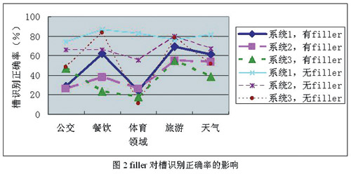 對(duì)于電話連續(xù)語(yǔ)音識(shí)別來(lái)說(shuō),由于錄制環(huán)境是辦公室真實(shí)環(huán)境,因此噪音并不是影響性能的主要因素。電話連續(xù)語(yǔ)音識(shí)別分為5個(gè)子領(lǐng)域,每個(gè)子領(lǐng)域各有一套語(yǔ)法。評(píng)測(cè)句子由語(yǔ)法生成的有效成分在前后加上任意長(zhǎng)的填充詞(filler)構(gòu)成,如語(yǔ)法生成的句子為“從天安門到中關(guān)村怎么坐公交車”,而實(shí)際錄制的句子是“你好,請(qǐng)問(wèn)從天安門到中關(guān)村怎么坐公交車,可以查到嗎?”,其中的“你好,請(qǐng)問(wèn)”和“可以查到嗎”就是filler。由分析可以發(fā)現(xiàn),不同領(lǐng)域內(nèi)的槽識(shí)別正確率相差很大。這主要有兩個(gè)原因,一是不同領(lǐng)域的語(yǔ)法復(fù)雜度不同,二是不同領(lǐng)域內(nèi)有filler的句子所占比例不同。為了進(jìn)一步衡量filler對(duì)識(shí)別的影響,選取三個(gè)識(shí)別系統(tǒng),將有filler的句子和沒有filler的句子分別計(jì)算識(shí)別率,統(tǒng)計(jì)結(jié)果如圖2所示。從圖中可以看出,filler對(duì)識(shí)別的影響是相當(dāng)大的,無(wú)filler的句子比有filler的句子識(shí)別正確率可以高幾十個(gè)百分點(diǎn)。