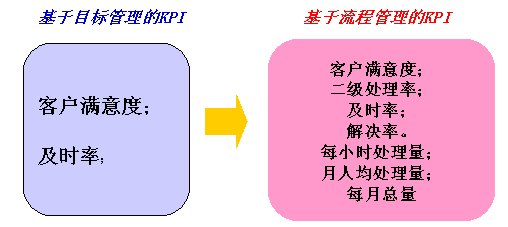 - 基于目標(biāo)的KPI不一定和流程相聯(lián)系,而基于流程的KPI一定是和流程相聯(lián)系的,基于流程的任一KPI一定有相應(yīng)的流程來保證其實(shí)現(xiàn)。如以前沒有人明確知道“接通率”是和哪一個流程相聯(lián)系的,該指標(biāo)是由哪一個流程來保證實(shí)現(xiàn)的。