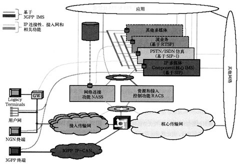業(yè)務(wù)層包括下面的元素:PSTN/ISDN模擬子系統(tǒng)(PSS)即IMS核心子系統(tǒng)、PSTN/ISDN仿真子系統(tǒng)(PES)、其他多媒體子系統(tǒng)(如流媒體子系統(tǒng)、內(nèi)容多播子系統(tǒng)等)和應(yīng)用以及可以用于多個(gè)子系統(tǒng)的公共元素(如接入應(yīng)用、計(jì)費(fèi)功能、用戶屬性管理、安全管理和路由管理等);傳送層為用戶終端提供了基本的IP連接的能力,其中的網(wǎng)絡(luò)附屬子系統(tǒng)(NASS)和資源認(rèn)證控制子系統(tǒng)(RACS)屏蔽了IP層以下的接入網(wǎng)/核心網(wǎng)所使用的傳送技術(shù),給固網(wǎng)NGN用戶終端提供了IP的連續(xù)性。