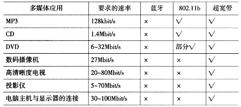 2.0接口相當(dāng),遠(yuǎn)遠(yuǎn)高于無線局域網(wǎng)802.11b的11 Mbit/s,也比下一代無線局域網(wǎng)802.11a/g的54 Mbit/s高出近一個(gè)數(shù)量級。UWB通信的功耗較低,能更好地滿足使用電池的移動設(shè)備的要求。另外,UWB信號的功率譜密度非常低,信號難以被檢測到,再加上采用的跳頻、直接序列擴(kuò)頻等擴(kuò)頻多址技術(shù),使非授權(quán)者很難截獲傳輸?shù)男畔,因而安全性非常好。?是一些典型的實(shí)時(shí)多媒體應(yīng)用對不同無線傳輸技術(shù)的數(shù)據(jù)傳輸速率的要求。從表中可以看出,如果采用無線的方式來進(jìn)行傳輸,只有UWB技術(shù)可以滿足各種應(yīng)用的要求。