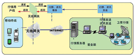 用戶借助無線終端通過無線接入網(wǎng)關(guān)登錄到移動證券業(yè)務(wù)平臺,移動證券業(yè)務(wù)平臺根據(jù)無線終端的請求類別提供實(shí)時的證券服務(wù)。