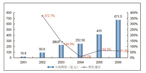 圖 2001-2006年中國(guó)移動(dòng)用戶(hù)增值業(yè)務(wù)市場(chǎng)規(guī)模