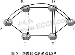 ....用圖2所示的6節(jié)點(diǎn)光網(wǎng)絡(luò)來(lái)闡述整個(gè)組播信令流程。與IP組播不同,點(diǎn)到多點(diǎn)LSP并不需要額外的組播組管理協(xié)議。這是因?yàn)槿~子節(jié)點(diǎn)的地址直接被包括在請(qǐng)求中,而不像IP組播中僅僅只是使用一個(gè)D類地址。所有的組播樹(shù)請(qǐng)求都將用一個(gè)三元組來(lái)表示{T,a,L},其中T是組播樹(shù)的標(biāo)識(shí)符,s是源節(jié)點(diǎn),L是組播樹(shù)的葉子集合。當(dāng)T等于O的時(shí)候意味著這是一個(gè)組播樹(shù)建立請(qǐng)求。例如,源節(jié)點(diǎn)A希望建立一個(gè)到葉子E和F的組播樹(shù),那么這個(gè)請(qǐng)求就被表示為{0,A,{E,F(xiàn)}}。當(dāng)這顆樹(shù)被建立后,它將被分配一個(gè)全局唯一的標(biāo)識(shí)符,比如1。請(qǐng)求{1,A,{C1}}和{1,A,{F}}則分別意味著將葉子C嫁接到組播樹(shù)1和將葉子F從組播樹(shù)1中剪除。如果想刪除整棵樹(shù),只需要將組播樹(shù)1的所有葉子都剪除即可,即{1,A,{C,E}}。