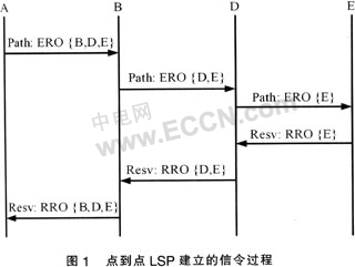 Switching Path)建立的信令過(guò)程。當(dāng)入口標(biāo)記交換路由器(LSR:Label Switching Router)A接收到一個(gè)業(yè)務(wù)請(qǐng)求后,它根據(jù)路由控制模塊計(jì)算出來(lái)的路由填寫顯示路由對(duì)象(ERO:Explicit