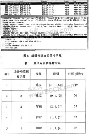 1出發(fā)的組播樹(shù)和單播連接,結(jié)果如表1所列。圖6顯示了Ethereal捕獲的組播樹(shù)建立的信令消息。在解開(kāi)的Path消息中,可以發(fā)現(xiàn)經(jīng)過(guò)擴(kuò)展的UNI組播對(duì)象。然后,對(duì)已存在的連接進(jìn)行了動(dòng)態(tài)的修改。在第三個(gè)測(cè)例中,一個(gè)葉子被添加到單播連接上并使其變?yōu)橐豢媒M播樹(shù)。在嫁接和剪枝的操作中,業(yè)務(wù)生成器在已建立的連接上沒(méi)有觀察到丟包的現(xiàn)象。