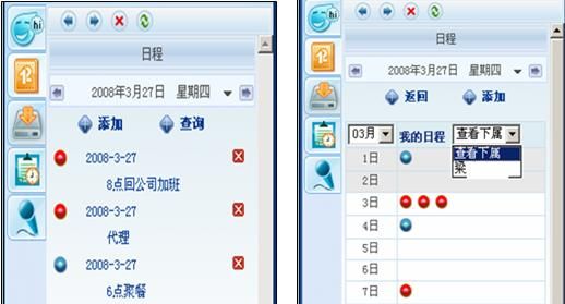 我們用過(guò)OUTLOOK的電子日程和手機(jī)自帶的日程功能都知道,電腦本機(jī)和手機(jī)實(shí)現(xiàn)日程管理都又各自很大的局限性,優(yōu)你客巧妙的實(shí)現(xiàn)了日程的網(wǎng)絡(luò)化管理并可以捆綁在手機(jī)提醒上,獨(dú)特又實(shí)用。其中紅綠日程各自代表工作和個(gè)人事務(wù),其中工作日程還能共享給上級(jí)。