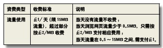 和黃3英國的數(shù)據(jù)業(yè)務(wù)資費(fèi)同樣采用按流量費(fèi)和信息內(nèi)容費(fèi)雙重計費(fèi)模式,月付費(fèi)用戶上網(wǎng)產(chǎn)生的流量按£2/MB收費(fèi),預(yù)付費(fèi)用戶按£1/MB收費(fèi)。