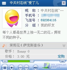 你可以點擊藍(lán)色文字鏈接,在彈出的窗口中單擊左下角的“播放/暫停”按鈕,以實現(xiàn)在PC機(jī)上聽好友彩鈴(如圖5)!這樣的功能其它IM軟件好像沒有,唯飛信才有的獨家功能!